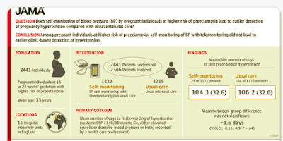 Elle compare l'automesure associée au télémonitorage contre une surveillance "normale" chez des femmes enceintes à haut risque de prééclampsie : le diagnostic d'HTA n'est pas différent.